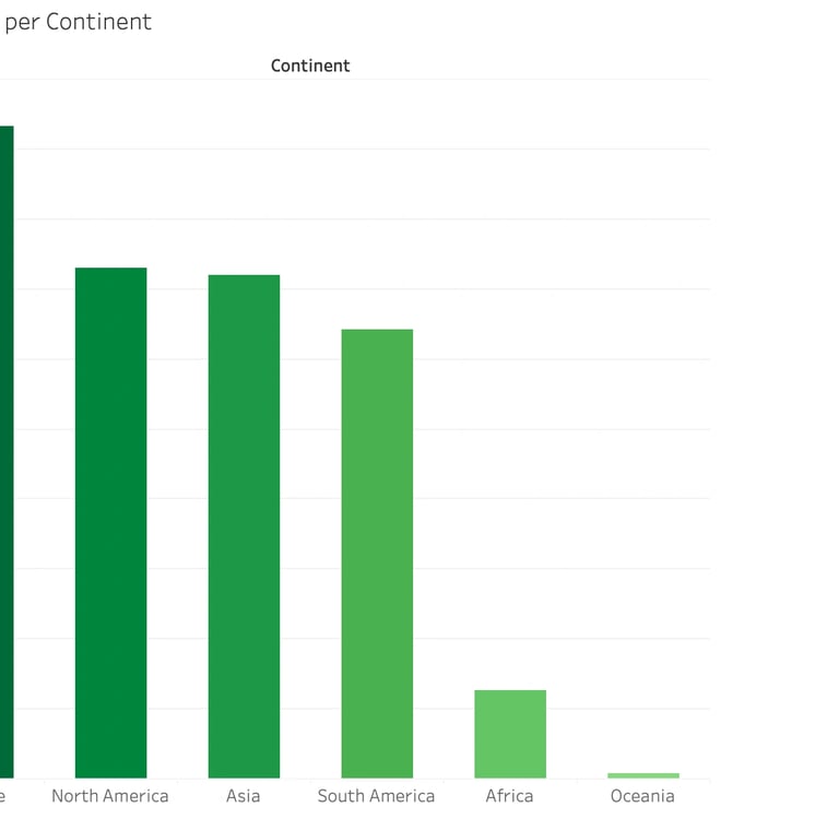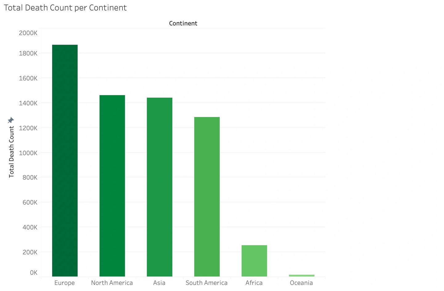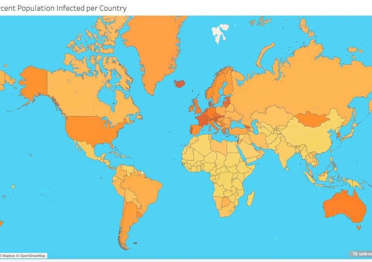 Tableau dashboard exploring global COVID-19 data, including case counts, deaths by continent, infection rates, and time-series trends across countries.